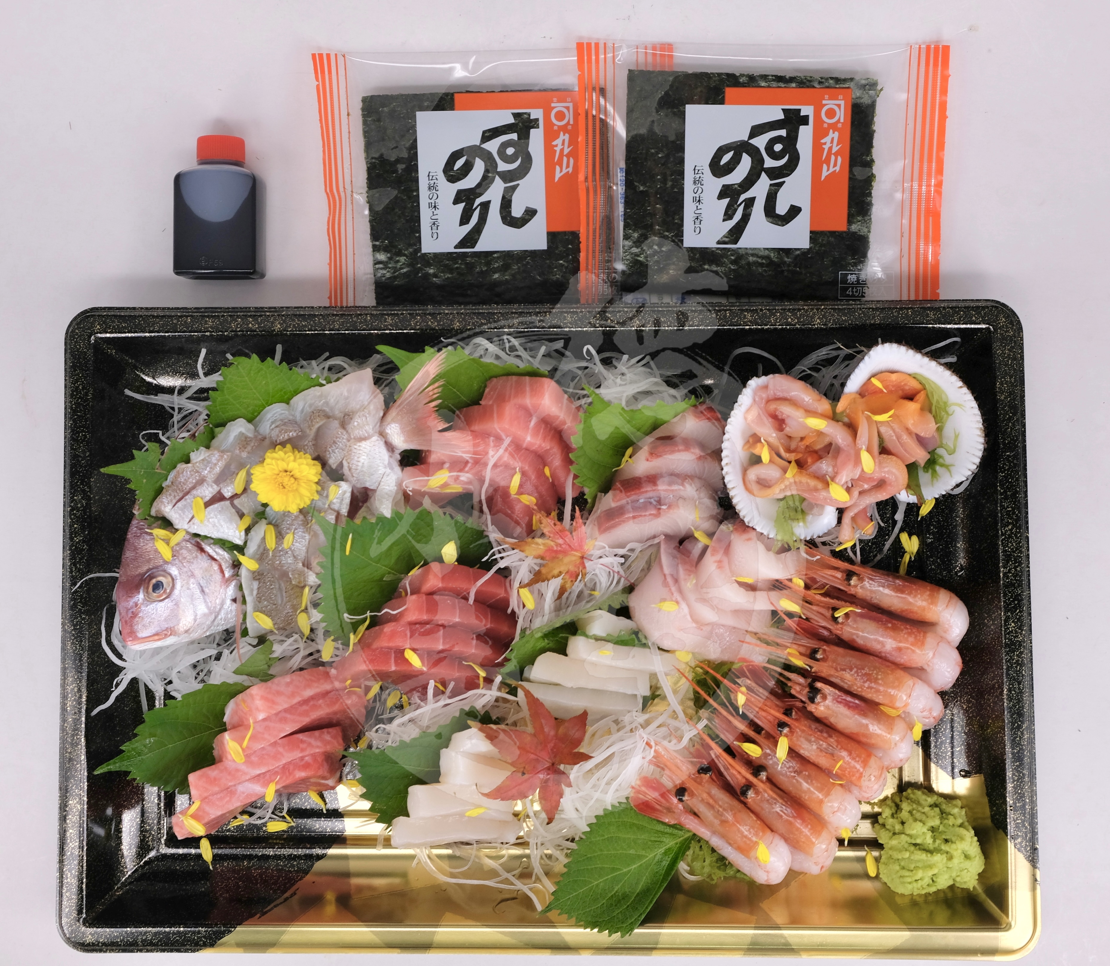 sashimi sauce, wasabi, seaweeds